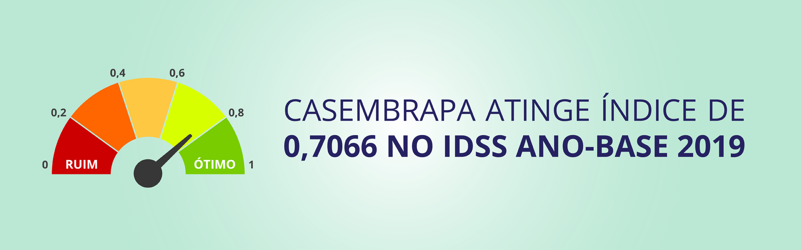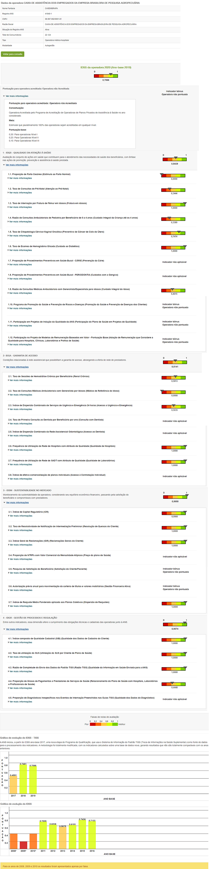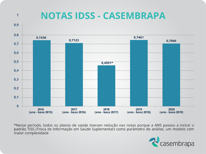 A Casembrapa obteve índice de 0,7066, em uma escala de 0 a 1, na avaliação pelo Índice de Desempenho de Saúde Suplementar (IDSS 2020 – ano-base 2019), da Agência Nacional de Saúde Suplementar (ANS). O indicador IDSS faz parte do Programa de Qualificação de Operadoras (PQO), que permite análise do desempenho de operadoras de saúde por um conjunto de fatores agrupados.