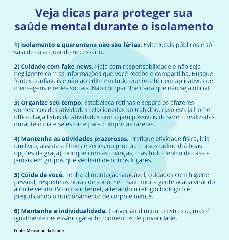 O isolamento social é importante como ação de combate à disseminação do coronavírus, mas também pode afetar a saúde mental das pessoas, levando à ansiedade, mudança de humor e a alterações comportamentais. Por isso, neste momento em que a recomendação é ficar em casa, é essencial ter cuidado também com a cabeça e buscar formas de lidar com a situação de modo a entender que o quadro é temporário e que em breve voltaremos todos à normalidade.