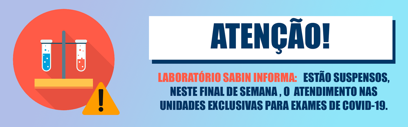 Informamos que neste final de semana (15 e 16/01), o Laboratório Sabin suspenderá o atendimento nas Unidades Exclusivas para Exames Covid-19 no DF, em virtude do aumento na procura por atendimento em suas unidades e para que o grupo consiga restabelecer a capacidade produtiva.